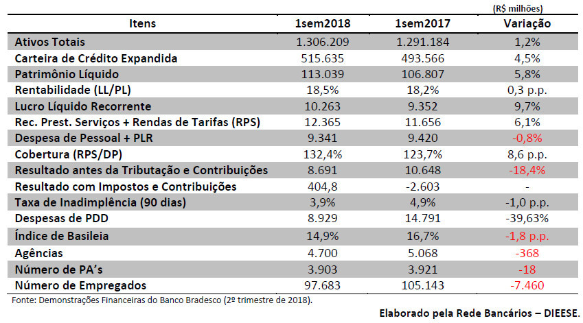 O Bradesco teve lucro líquido Recorrente de R$ 10,263 bilhões, no 1º semestre de 2018, com crescimento de 9,7%, em relação ao mesmo período de 2017 e de 1,2% no trimestre. A rentabilidade (retorno sobre o Patrimônio Líquido médio anualizado – ROE) alcançou 18,5%, com aumento de 0,3 pontos percentuais em doze meses. Segundo o banco, o resultado do período foi impulsionado pela performance das receitas de prestação de serviços, pelo resultado das operações com seguros, previdência e capitalização e pela redução nas despesas com Provisões para Devedores Duvidosos (PDD), segundo análise do Departamento Intersindical de Estatística e Estudo Sociais (Dieese).