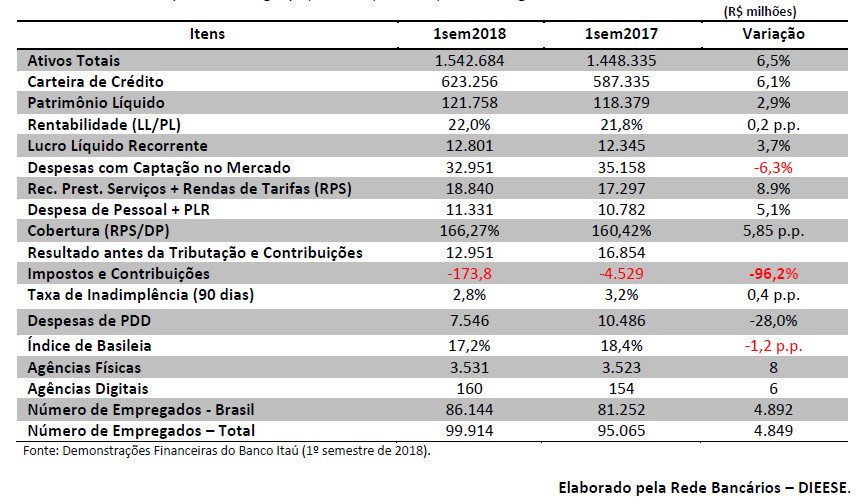 O Banco Itaú obteve um Lucro Líquido Recorrente de R$ 12,801 bilhões no 1º semestre de 2018, crescimento de 3,7% em relação ao mesmo período de 2017. A rentabilidade (retorno sobre o Patrimônio Líquido médio anualizado – ROE) ficou em 22%, com aumento de 0,2 pontos percentuais em doze meses, segundo análise elaborada pelo Departamento Intersindical de Estatística e Estudos Socioeconômicos (Dieese).