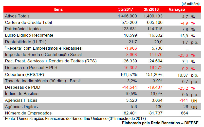 O banco Itaú obteve um Lucro Líquido Recorrente (que exclui efeitos extraordinários) de R$ 18,6 bilhões de janeiro a setembro de 2017, segundo análise do balanço do banco feito pelo Departamento Intersindical de Estatística e Estudos Socioeconômicos (Dieese). O valor representa um crescimento e 13,9% em relação ao mesmo período de 2016 e de 1,4% no terceiro trimestre. A rentabilidade (Patrimônio Líquido Médio Anualizado – ROE) foi de 21,7%, com alta de 1,7 pontos percentuais em 12 meses.