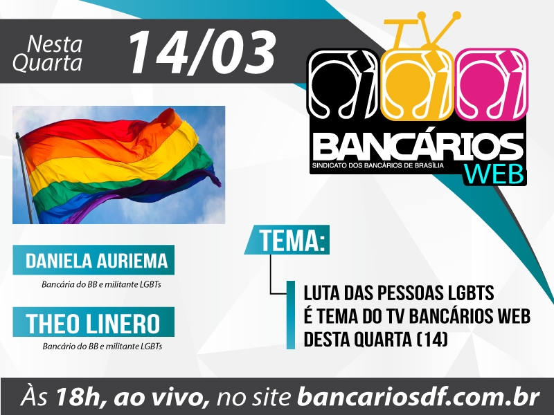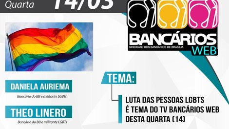 A edição desta quarta-feira (14) do TV Bancários Web apresenta um debate sobre a pauta de luta da população LGBT. Como convidados, o programa recebe Daniela Auriema e Theo Linero, pessoas trans, bancários do BB e militantes LGBTs. O programa será transmitido a partir de 18h pelo portal do Sindicato e pelas redes sociais da entidade.