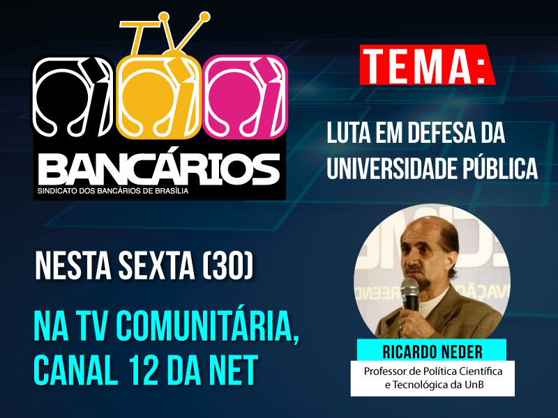 O programa TV Bancários na TV Comunitária desta sexta-feira (30), às 14h30, tem como tema “A luta em defesa da universidade pública”. Para discutir o assunto foi convidado o professor de Política Científica e Tecnológica da Universidade de Brasília (UnB), Ricardo Neder.