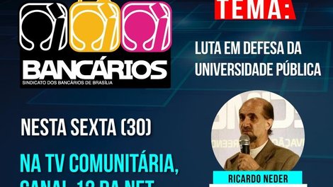 O programa TV Bancários na TV Comunitária desta sexta-feira (30), às 14h30, tem como tema “A luta em defesa da universidade pública”. Para discutir o assunto foi convidado o professor de Política Científica e Tecnológica da Universidade de Brasília (UnB), Ricardo Neder.