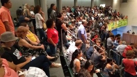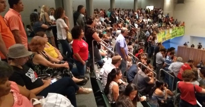 Desde o início da tarde dessa terça (26), a CLDF estava completamente lotada. Mas o que chamou atenção foi um grupo de pessoas que estenderam na galeria do plenário da Casa faixas com dizeres como “digam sim ao novo Iprev”. Por uma rede social, o Sindicato dos Servidores do Detran denunciou: “uma vergonha: Rollemberg convoca comissionados e cabos eleitorais para tumultuar a sessão”.