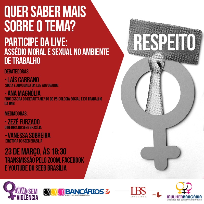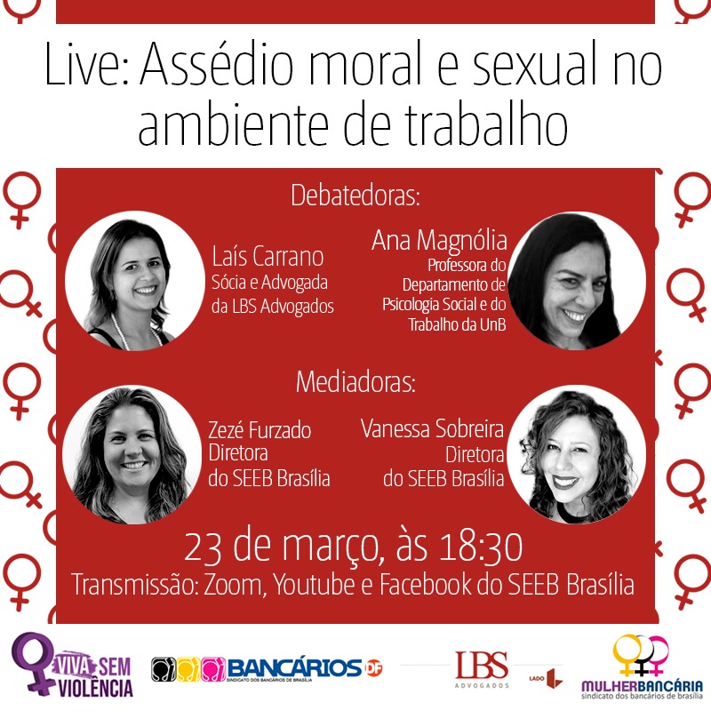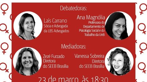 Foram convidadas para o debate duas profissionais que há anos trabalham lado a lado com o Sindicato. Uma delas é a doutora em Psicologia pela Universidade de Brasília, Ana Magnólia. Soma a atividade a advogada e sócia da LBS Advogados, Laís Carrano. As mediadoras e articuladoras deste encontro virtual são as diretoras do Sindicato Zezé Furtado, secretária de Mulheres, e Vanessa Sobreira, secretária de Saúde da entidade.