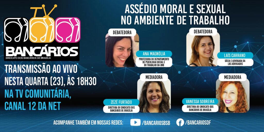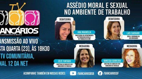 O TV Bancários com transmissão do debate sobre assédio moral e sexual no trabalho vai ao ar às 18h30, pela TV Comunitária (canal 12 da Net) e pelas redes sociais do Sindicato.