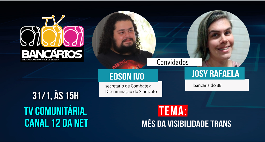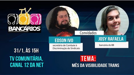 Marcado pelo dia 29 de janeiro, o Mês da Visibilidade Trans é pauta do TV Bancários desta sexta-feira (31). Nesta edição, o programa recebe o secretário de Combate à Discriminação do Sindicato Edson Ivo e a bancária do BB Josy Rafaela. O TV Bancários vai ao ar às 15h pela TV Comunitária (Canal 12 da Net) e pelas redes sociais do Sindicato.