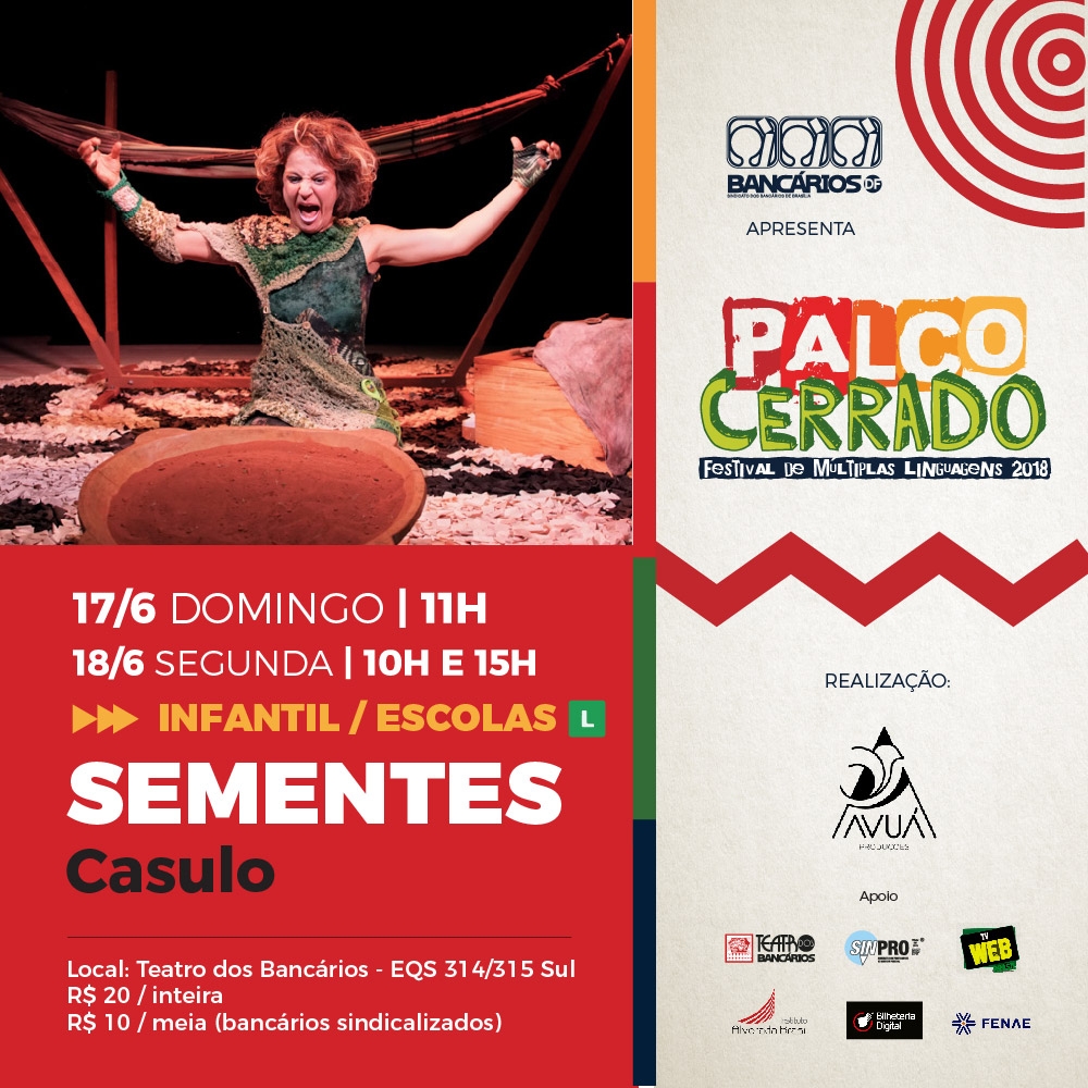 No dia 17, um domingo, às 11h, será a vez do grupo Casulo apresentar o espetáculo Sementes, no Teatro dos Bancários, dentro do Festival Palco Cerrado. Na segunda (18), a companhia retorna com duas apresentações direcionadas ao público infantil das escolas públicas do DF, às 10h e às 15h.