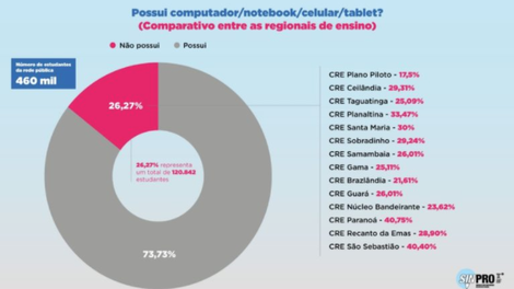 Uma pesquisa inédita realizada pelo Sindicato dos Professores no Distrito Federal (Sinpro-DF), na semana passada, revela que 26,27% dos 460 mil estudantes da rede pública de ensino do DF não têm condições materiais de assistirem e participarem de nenhum tipo de Educação a Distância (EaD).