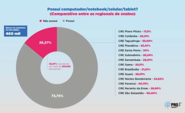Ao analisar os resultados da pesquisa, outras situações foram reveladas. Dentre elas, destaca-se o fato de a desigualdade social se refletir de forma diferente nas regiões pesquisadas do DF. Estudantes do Paranoá e de São Sebastião são os que têm menos acesso aos equipamentos necessários para acompanhar aulas a distância pela Internet.