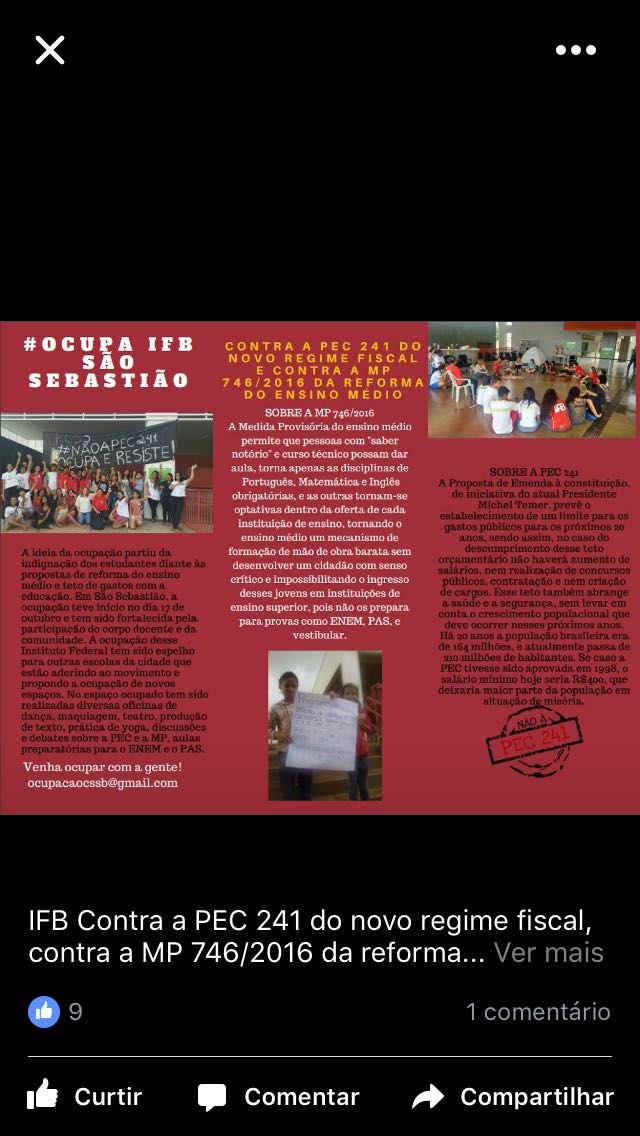 Os alunos ressaltam a importância de melhorar o ensino médio, mas defendem que eles, os professores e os funcionários de escolas e institutos federais precisam ser ouvidos antes dessas mudanças serem implementadas. E repudiam a PEC 241 que vai reduzir os investimentos na educação.