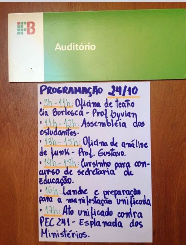 Em todo o país, já são 1.016 escolas públicas, 51 universidades e 82 institutos federais ocupados por estudantes em reação à medida provisória (MP) que reforma o ensino médio e a PEC 241, que impõe um limite aos gastos públicos pelos próximos 20 anos. No DF, duas escolas (os Centros de Ensino Médio 414 e 304 de Samambaia), o Centro Educacional Gisno na Asa Norte) e cinco institutos federais (Cidade Estrutural, São Sebastião, Samambaia, Riacho Fundo e Asa Norte) aderiram ao movimento. Também foram ocupados nesta segunda-feira (24) o Centrão Planaltina e o Cemso, na Asa Sul.