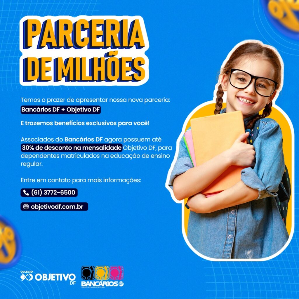 Parceria de milhões! Os bancários sindicalizados e seus dependentes poderão usufruir de mais vantagens exclusivas na área da educação, desta vez com a parceria firmada entre o Sindicato e o Colégio Objetivo DF.