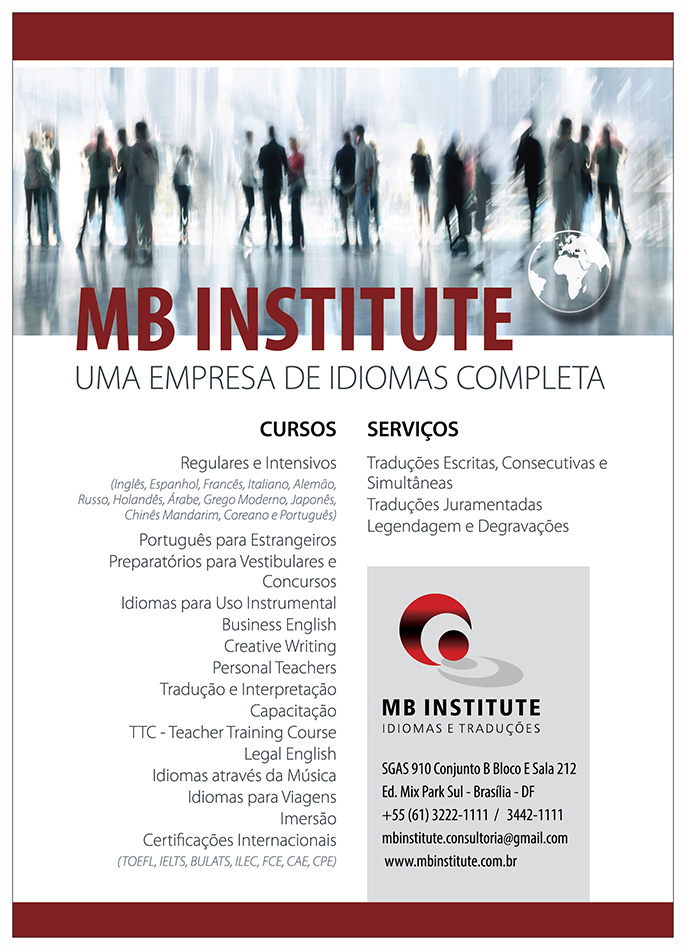 O MB Institute Idiomas & Traduções fica na SGAS 910, Conjunto B, Bloco D, Sala 107, Asa Sul. Mais informações: http://www.mbinstitute.com.br/.