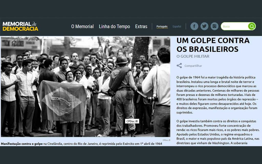 Para contar essa história, que é da luta e resistência no Brasil, foi criado em setembro de 2015, o Memorial da Democracia. É um museu virtual multimídia, com textos, fotos, vídeos e áudios com informações de 1929 a 2010, destaca o jornalista, que ajudou a criar o memorial. “A ideia é recuperar a luta pela democracia no país”.