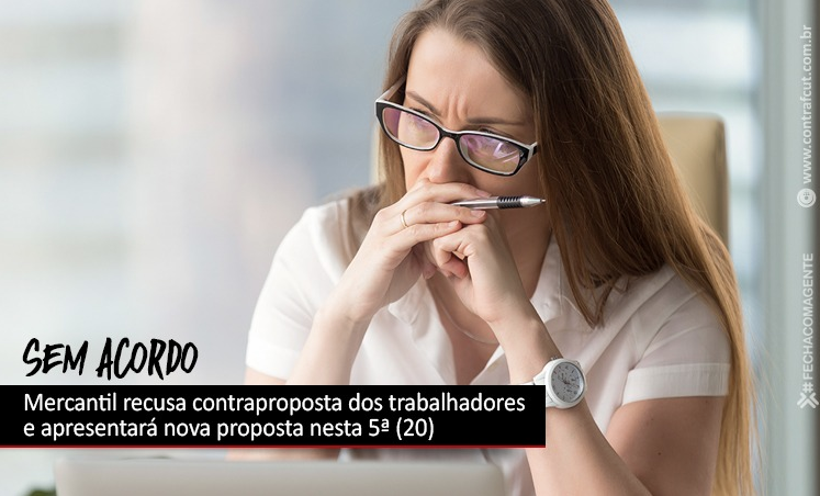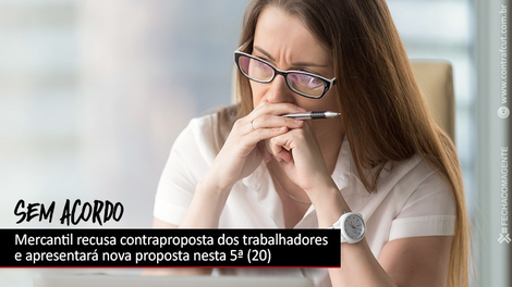 Os representantes do Mercantil do Brasil se mostraram intransigentes em reunião de negociações realizada nesta quarta-feira (19), negaram as reivindicações dos trabalhadores e cogitaram, mais uma vez, na possibilidade de firmarem acordos individuais diretamente com os funcionários. A negociação foi mediada pelo Ministério Público de Minas Gerais (MPT/MG)