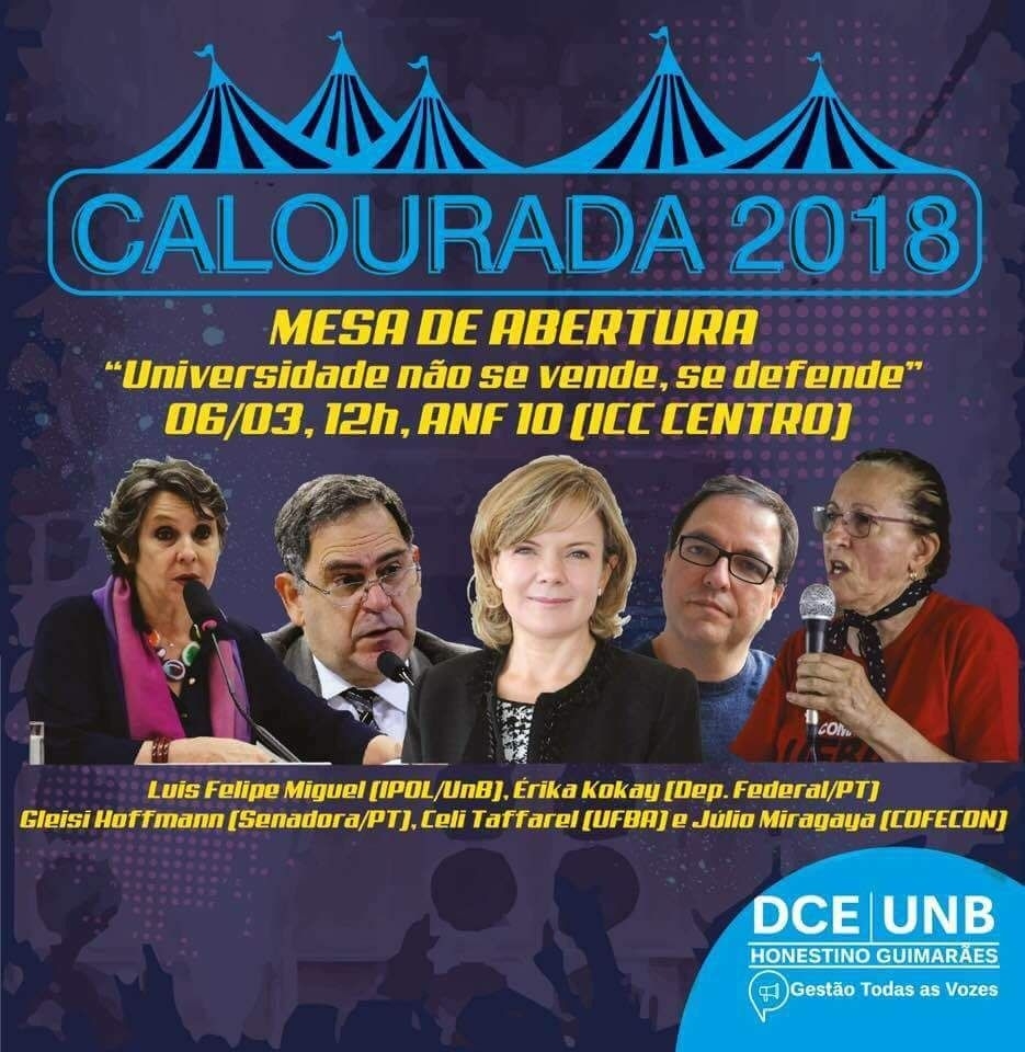 Para o evento de boas-vindas dos calouros da UnB, a Gestão Todas as Vozes, à frente do DCE Honestino Guimarães, receberá o presidente do Conselho Federal de Economia (COFECON), Júlio Miragaya, a professora da Universidade Federal da Bahia (UFBA), Celi Taffarel, a deputada federal e bancária da Caixa, Erika Kokay, e a senadora Gleisi Hoffmann.