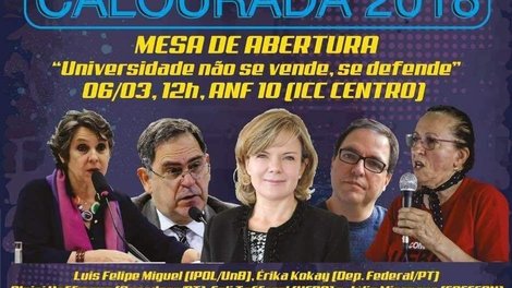 “Universidade não se vende, se defende – Não ao Estado de Exceção”. Este é o tema da mesa de abertura do Calourada 2018, encontro que recepciona os novos alunos da Universidade de Brasília (UnB), cujas aulas começam na quarta-feira. O debate será realizado nesta terça-feira (6), no anfiteatro 10 do Campus Darcy Ribeiro, às 12h.