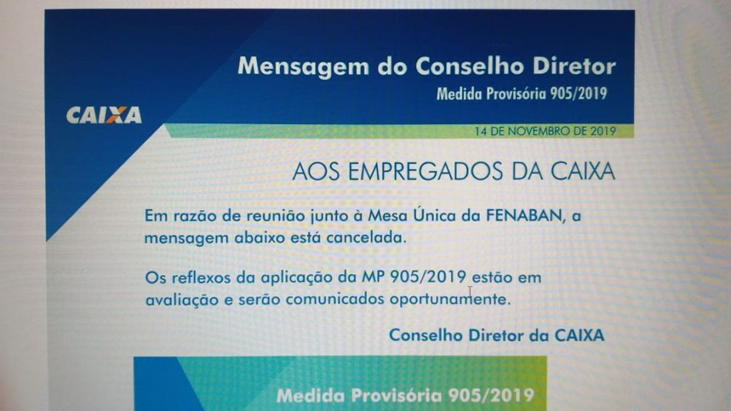 Em razão da mesa de negociação entre o Comando Nacional dos Bancários e a Fenaban nesta quinta-feira (14), que está em andamento, a Caixa enviou mensagem aos empregados revogando o comunicado sobre a aplicação da MP 905/19 divulgado ontem aos trabalhadores.