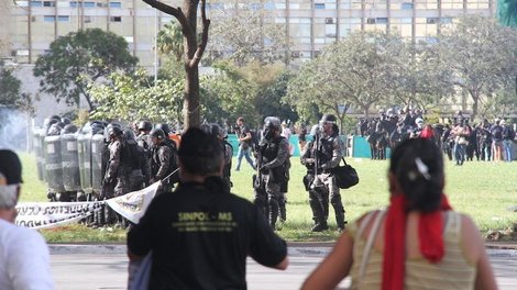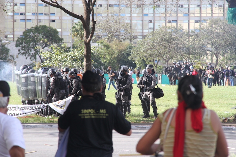 Após a marcha que saiu de forma ordeira, por volta do meio-dia, do Estádio Mané Garrincha rumo à Esplanada dos Ministérios, a polícia militar entrou em confronto violento com um pequeno grupo de manifestantes.