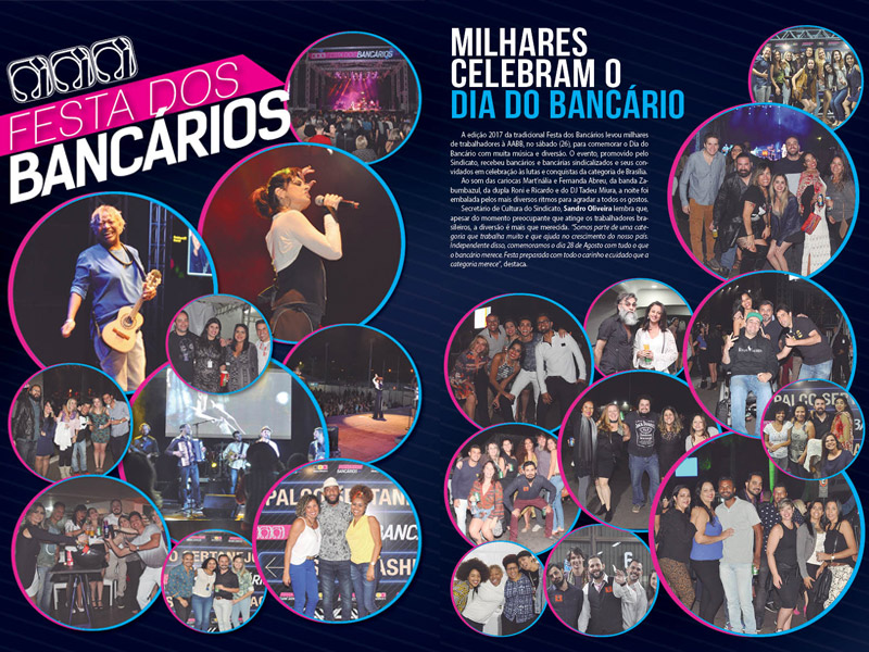 A edição 2017 da tradicional Festa dos Bancários levou milhares de trabalhadores à AABB, no sábado (26), para comemorar o Dia do Bancário com muita música e diversão. O evento, promovido pelo Sindicato, recebeu bancários e bancárias sindicalizados e seus convidados em celebração às lutas e conquistas da categoria de Brasília.