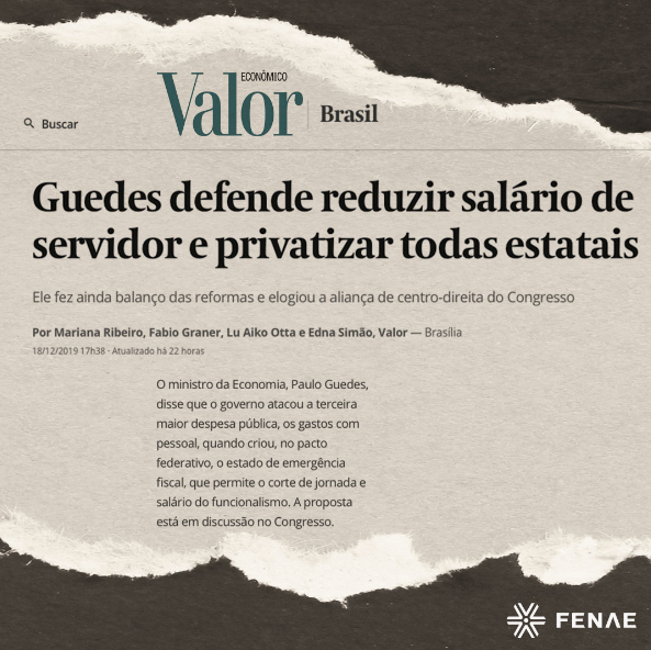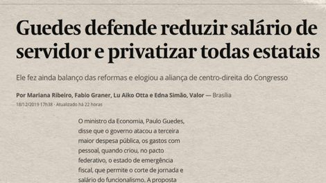 Big and Bold Target, Fast Track, Shutdown. Essas foram algumas das expressões em inglês usadas pelo ministro da Economia, Paulo Guedes, para tornar mais dourada a pílula amarga a qual pretende submeter o brasileiro no próximo ano, em especial os servidores públicos. Em entrevista à imprensa, ministro não deixa dúvida em relação à privatização: “todo ano eu vou tentar, vai ser possível? Não sei, mas vou tentar. E privatização? Vou vender tudo, essa é a meta!” , publicou o jornal Valor Econômico.
