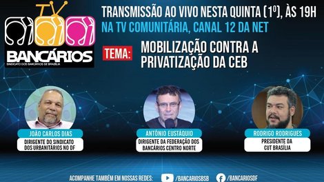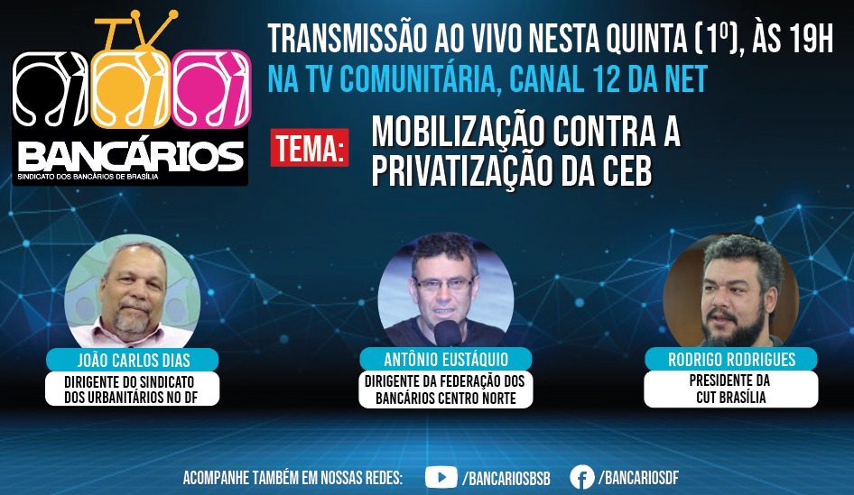 A TV Bancários desta quinta-feira (1º) dá destaque à mobilização dos trabalhadores para frear o processo de privatização da Companhia Energética de Brasília (CEB) posto em marcha acelerada pelo governo do Distrito Federal com a estratégia de ignorar e atropelar a opinião pública. O governador Ibaneis Rocha tenta, inclusive, afastar a Câmara Legislativa da discussão da venda da distribuidora de energia.