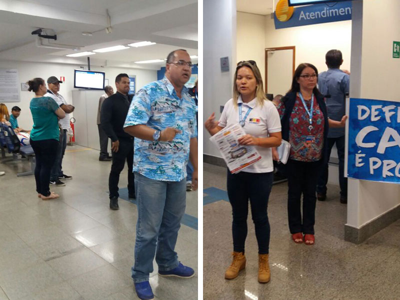 Assim como nas visitas realizadas na terça (9), o Sindicato fez a entrega a usuários e clientes de panfleto informativo em que destaca o papel que a Caixa exerce no atendimento das demandas de cunho social e no desenvolvimento econômico do Brasil, além de fazer um chamamento aos empregados para somar forças pela manutenção do caráter 100% público da instituição.