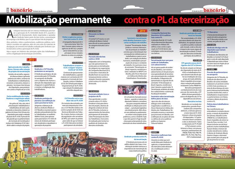 Atos, protestos, visitas a parlamentares, audiências públicas, seminários e reuniões em agências, além de uma série de materiais de divulgação, são amostras do trabalho realizado pelo Sindicato e pelos bancários contra a aprovação do PL 4330.