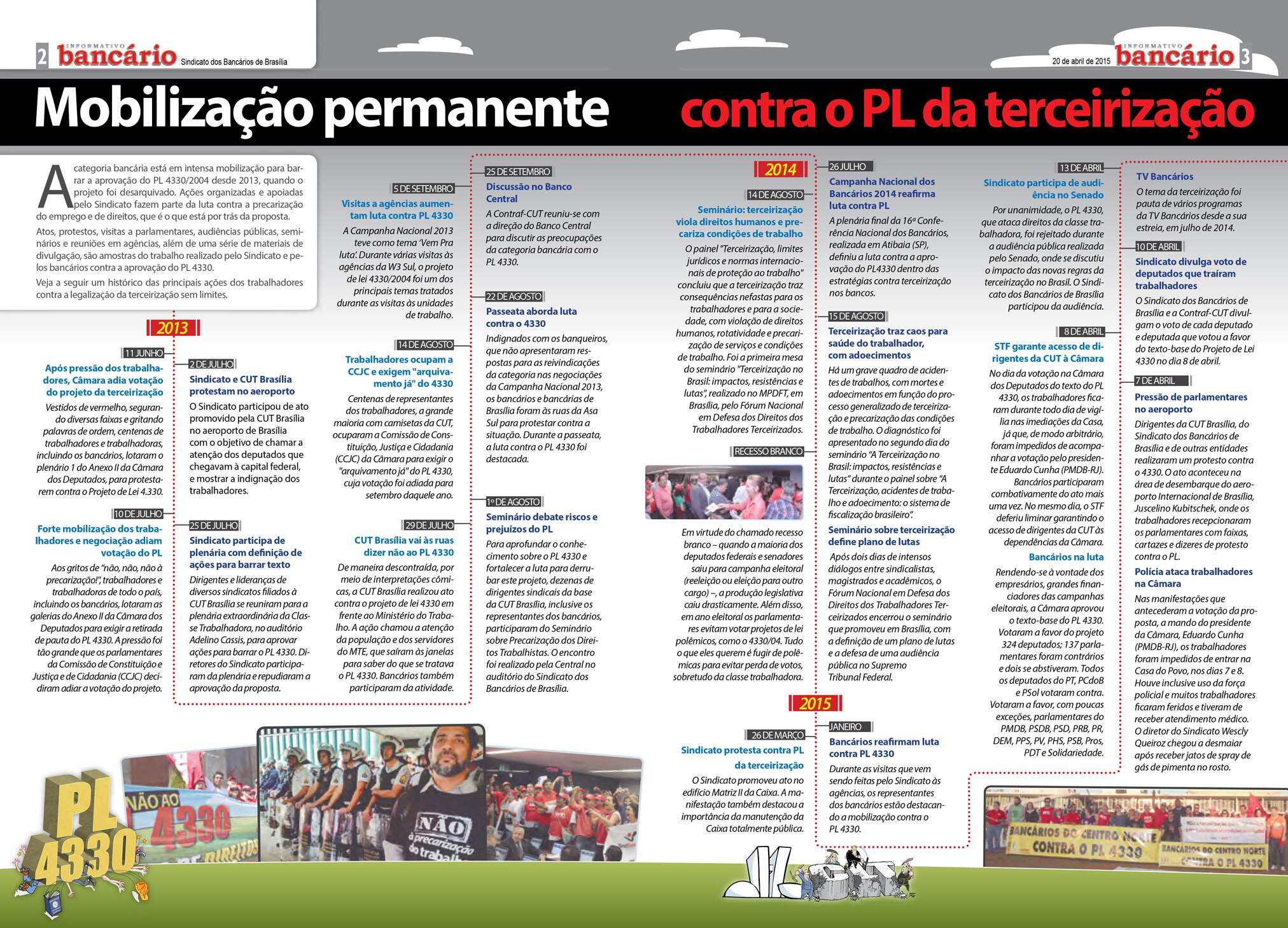 No dia da votação na Câmara dos Deputados do texto do PL 4330, os trabalhadores ficaram durante todo dia de vigília nas imediações da Casa, já que, de modo arbitrário, foram impedidos de acompanhar a votação pelo presidente Eduardo Cunha (PMDB-RJ). Bancários participaram combativamente do ato mais uma vez. No mesmo dia, o STF deferiu liminar garantindo o acesso de dirigentes da CUT às dependências da Câmara.
