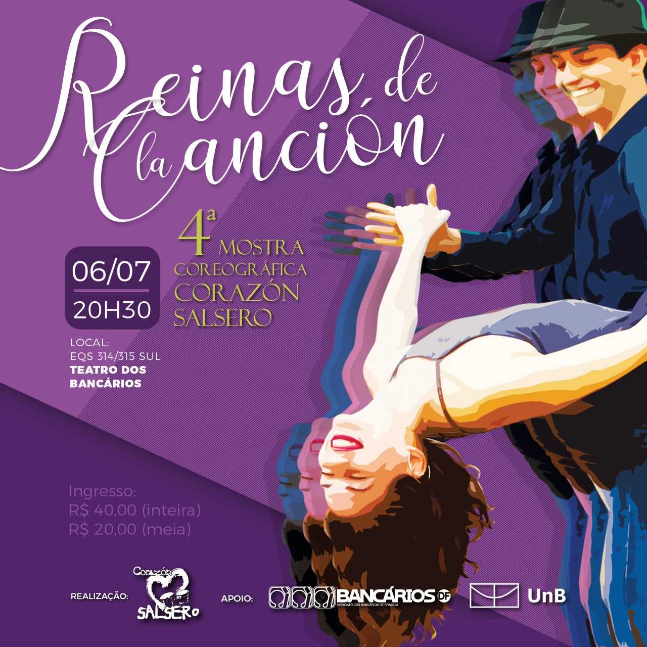O espetáculo “Reinas de la Canción” é atração no Teatro dos Bancários, nesta sexta-feira (06), às 20h30. Trata-se de uma mostra de dança promovida pelo grupo Corazón Salsero, com composições coreográficas que homenageiam mulheres que fizeram história na música caribenha e na cultura popular latino-americana.