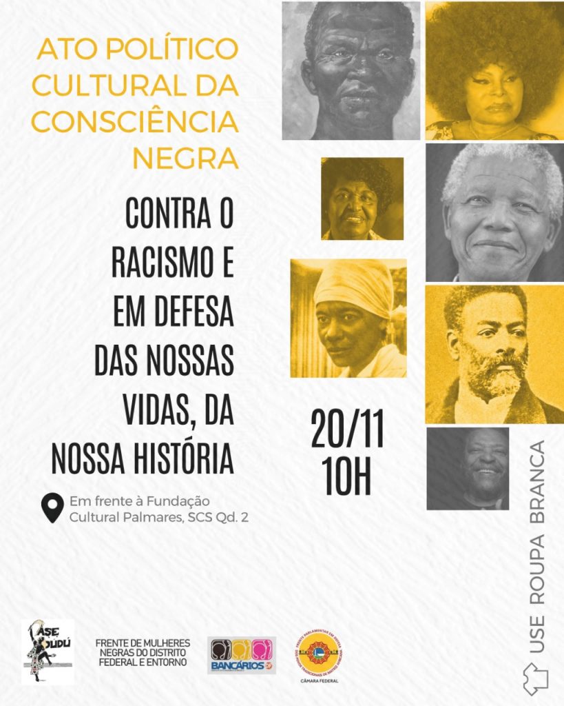 Ato Político-Cultural da Consciência Negra – Contra o Racismo e em Defesa das Nossas Vidas, da Nossa História. Sexta-feira, 20 de novembro, às 10h. Em frente à Fundação Cultural Palmares (SCS, Quadra 02).