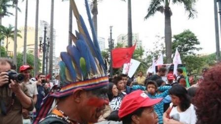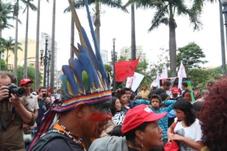 E no mundo dos juruás à espera da dança dos Guaranis Mbyá, os carrilhões da Catedral da Sé soaram pela primeira vez às cinco da tarde, talvez por não estarem acertados com o horário de verão. Militantes da CUT, MST, MAB, movimentos de moradia, Levante Popular da Juventude, entre outros, falavam à população que circulava pela Sé. Comunicadores do Fora do Eixo e do Mídia Ninja registravam tudo.