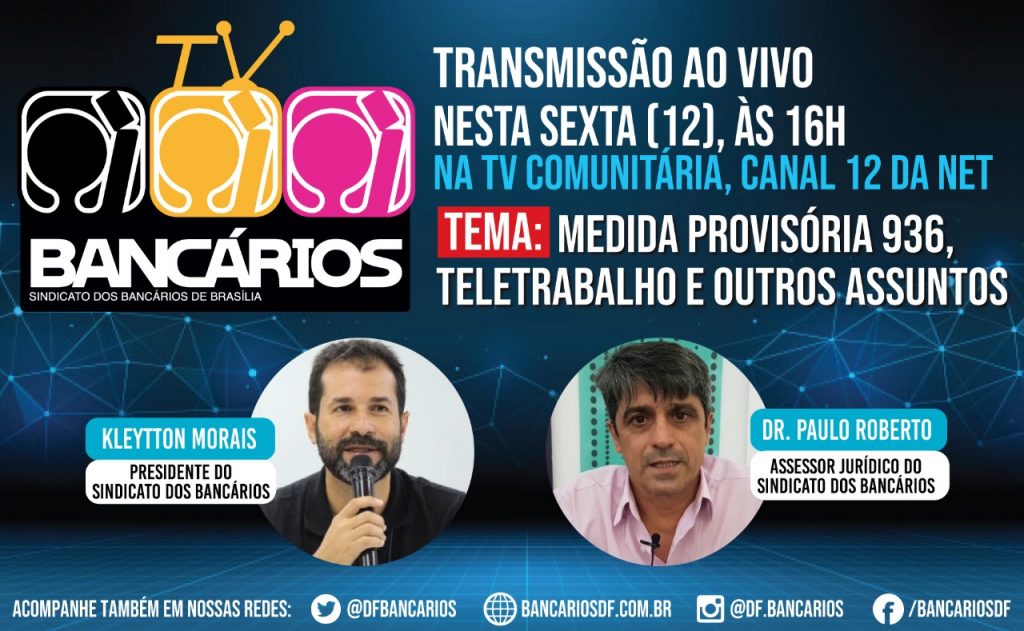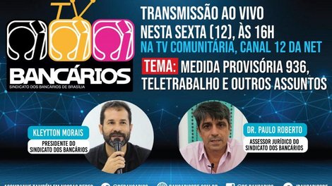 Nesta sexta-feira (12), a TV Comunitária de Brasília contará com uma edição especial do TV Bancários com debate sobre a Medida Provisória 936 entre o presidente do Sindicato Kleytton Morais e o advogado e assessor jurídico da entidade, Paulo Roberto. A discussão sobre temas relacionados ao mundo do trabalho em tempos de pandemia do nexo técnico epidemiológico, como o teletrabalho, vai ao ar, ao vivo, a partir das 16h pelas redes sociais do Sindicato e da TV Comunitária (canal 12 da Net).