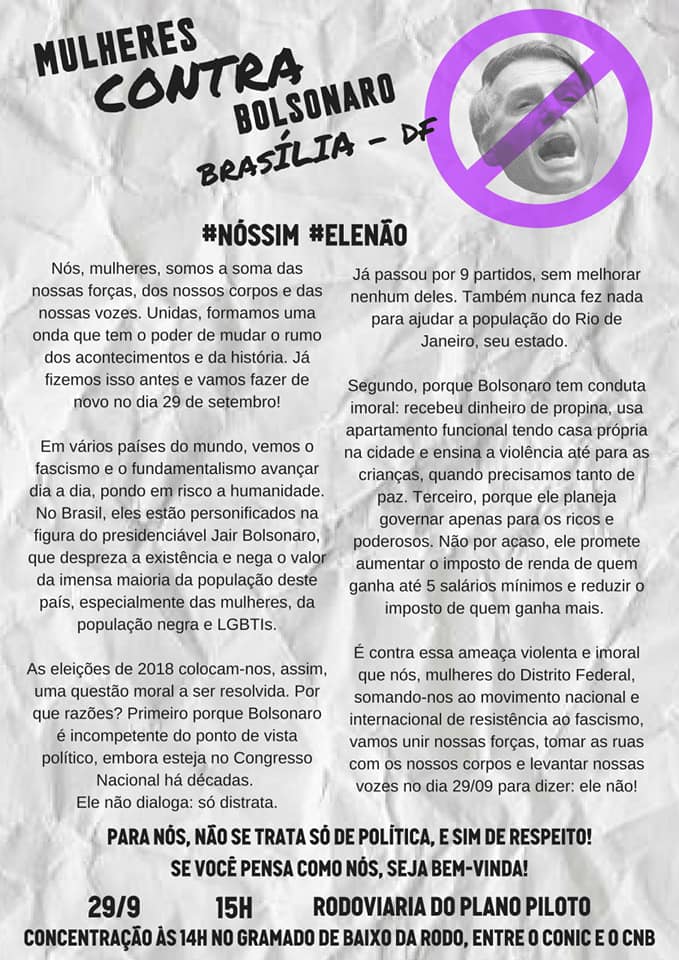 As falas machistas, misóginas, homofóbicas, racistas, retrógradas e conservadoras do presidenciável Jair Bolsonaro (PSL) não estão passando impunes. Dentro e fora do Brasil, grupos se insurgem contra os ataques do capitão da reserva do Exército. No próximo sábado, dia 29, mulheres e homens do Distrito Federal se somarão aos atos realizados em todo o país e no mundo contra Bolsonaro. Na capital do Brasil, a concentração da atividade será às 14h, no gramado da rodoviária do Plano Piloto (entre o Conic e o Conjunto Nacional). Às 15h, as ativistas sairão rumo à Torre de TV, onde será realizado ato político. Acesse aqui o evento.