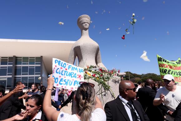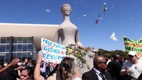 A estátua de Têmis, a deusa da Justiça, que fica em frente ao STF teve o colo coberto por flores e por cartazes nos quais se liam Fere o Corpo, Fere a Alma e Mulheres Contra a Cultura de Estupro.