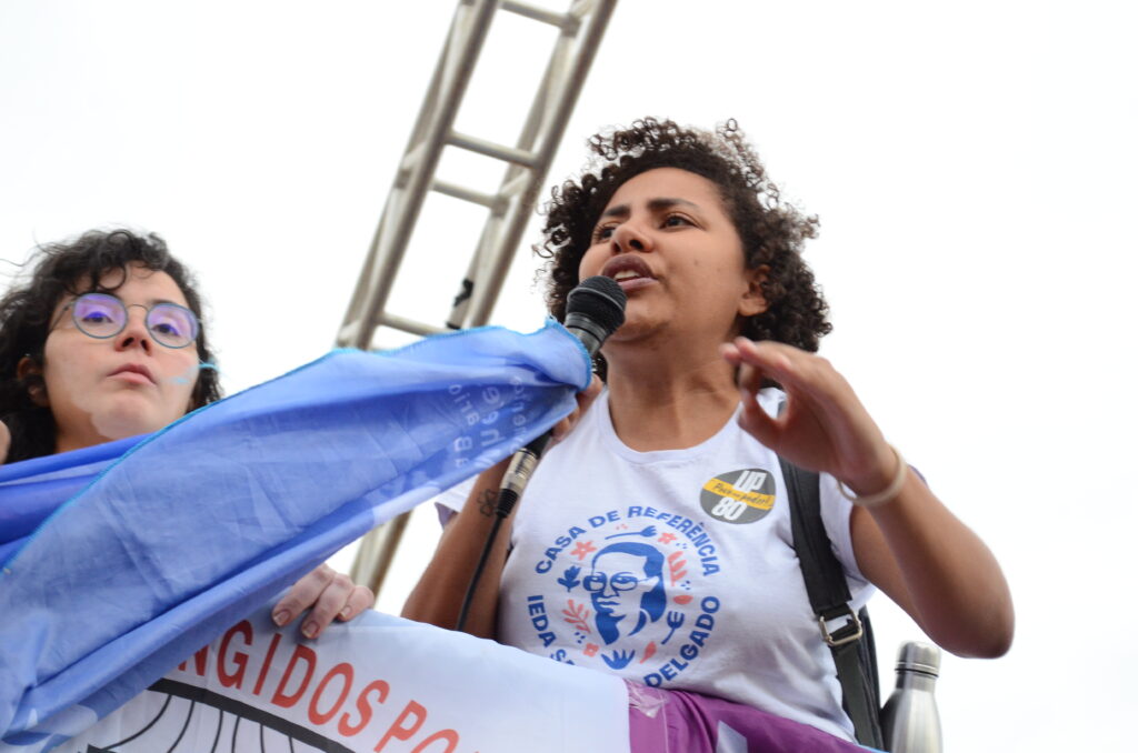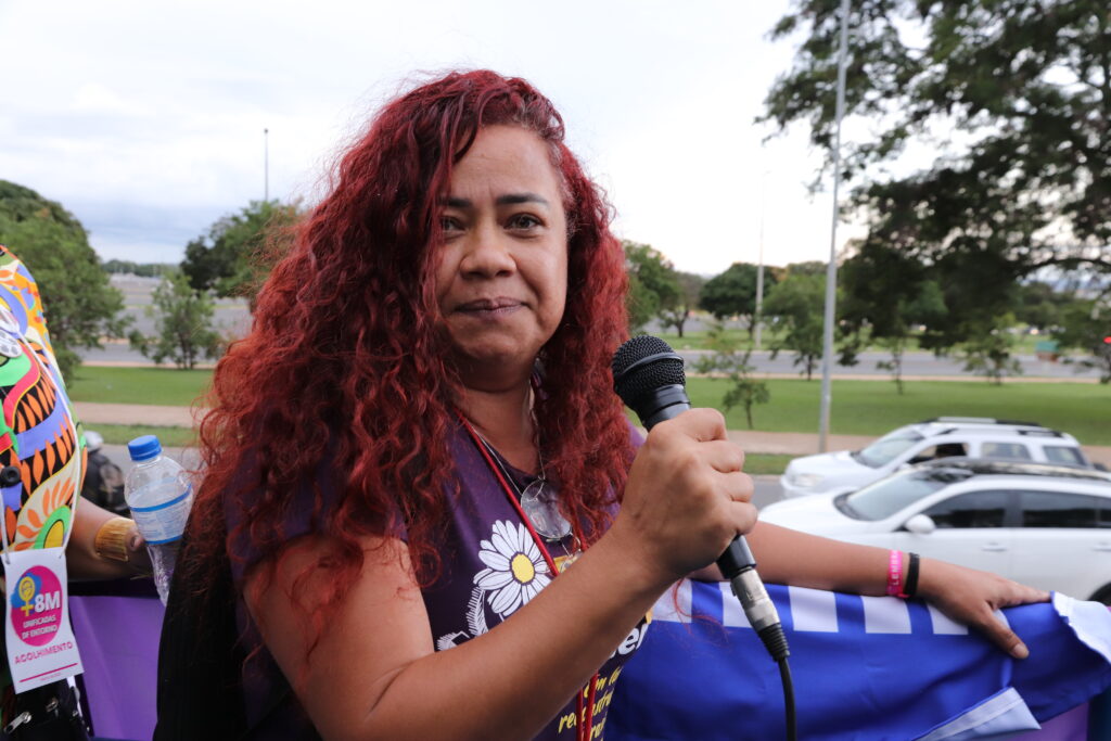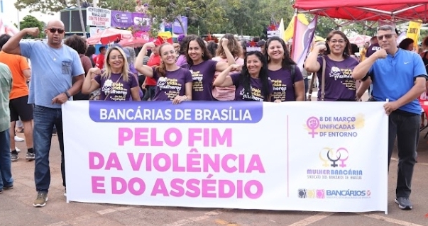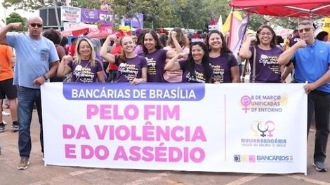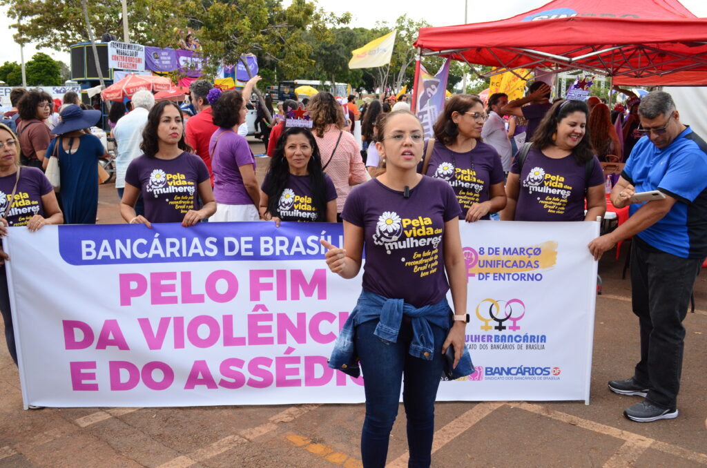“É preciso estar atento e forte, não temos tempo de temer a morte. Hoje, 8 de março de 2023, estamos aqui levando a nossa pauta de reivindicações ao governo do Distrito Federal. Tá linda a nossa marcha em direção ao Palácio do Buriti. E como diz o verso, não temos tempo de temer a morte, basta de feminicídio, parem de nos matar. E hoje é um dia muito especial porque foi assinada e enviada pelo presidente Lula ao Congreso a proposta de ratificação da Convenção 190 da OIT. Essa é uma grande vitória para as bancárias e bancários, porque sofremos muito com assédio no trabalho, e a Convenção 190 prega que não pode haver violência no ambiente de trabalho”, pontuou Zezé Furtado, secretária de Mulheres do Sindicato.