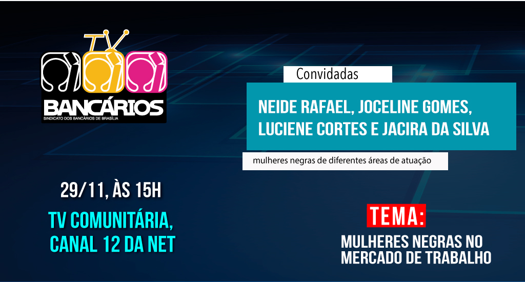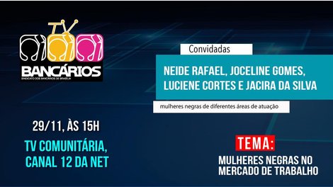 O último TV Bancários do Mês da Consciência Negra apresenta a experiência profissional e social de quatro mulheres negras de diferentes áreas de atuação. O programa vai ao ar às 15h desta sexta-feira (29) pela TV Comunitária de Brasília (Canal 12 da Net) e pelas redes sociais do Sindicato.