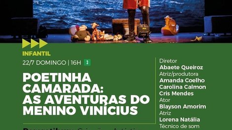 O musical infantil “Poetinha Camarada: As aventuras do menino Vinícius” encerra a terceira etapa do Palco Cerrado – Festival de Múltiplas Linguagens 2018, no dia 22 de julho, às 16h, no Teatro dos Bancários. O espetáculo propõe um diálogo sobre a importância da imaginação e das relações humanas, e de que forma podemos tornar o mundo um lugar melhor.