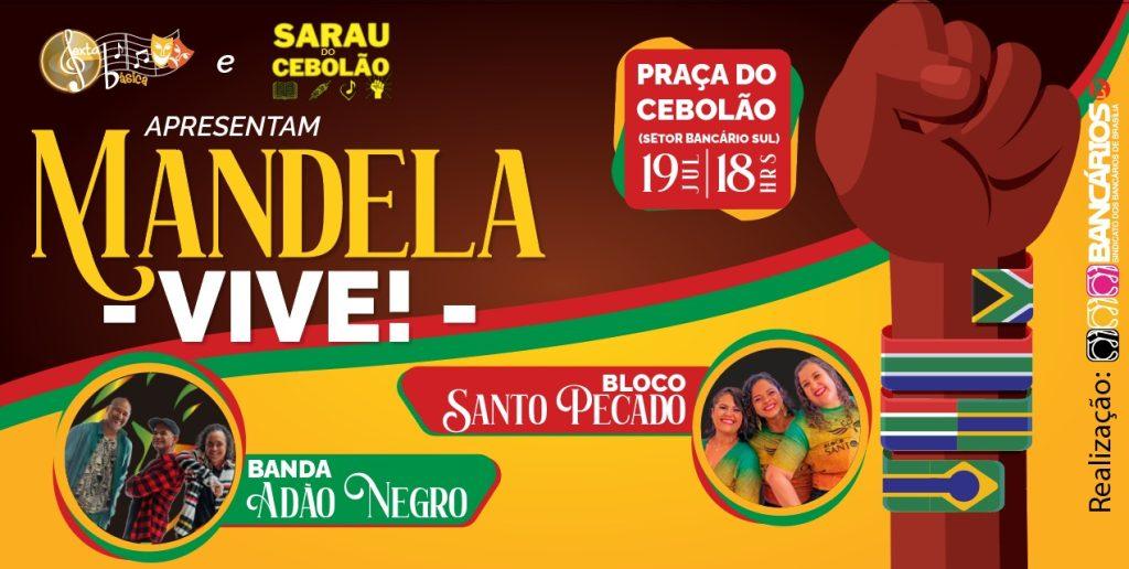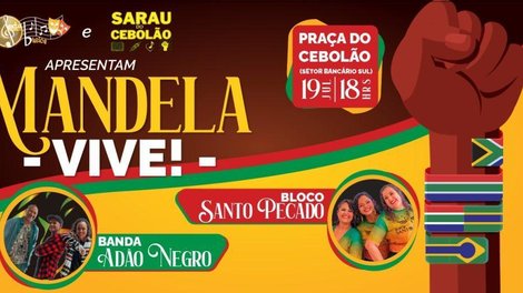 O projeto Sexta Básica e o Sarau do Cebolão apresentam Mandela Vive!, com a participação de Adão Negro e Santo Pecado. Os eventos, promovidos pelo Sindicato, serão realizados no dia 19 de julho, a partir das 18h, no SBS, na Praça do Cebolão, em frente ao prédio do Banco do Brasil (próximo ao Churrasquinho do Valdeci).