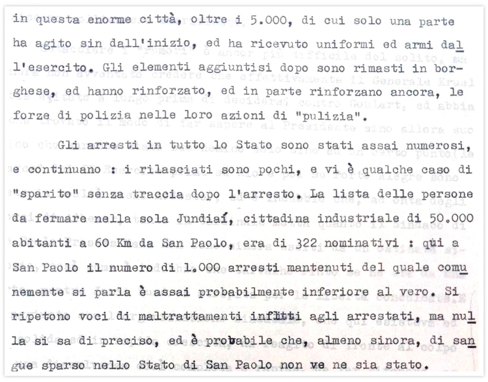 O texto chama as organizações civis que participaram do golpe de “heróis”. Sobre São Paulo, está registrado: “Nesta enorme cidade, além dos 5 mil, dos quais só uma parte agiu desde o início, e recebeu uniforme e armas do exército. Os elementos que se reuniram depois ficaram à paisana, e reforçaram, e em parte ainda reforçam, as forças policiais nas ações de limpeza”. O informe ainda aponta para as numerosas prisões que “continuam”. E cita os primeiros desaparecidos políticos. “Poucos são liberados e há alguns casos de desaparecimento sem rastro após a prisão.”