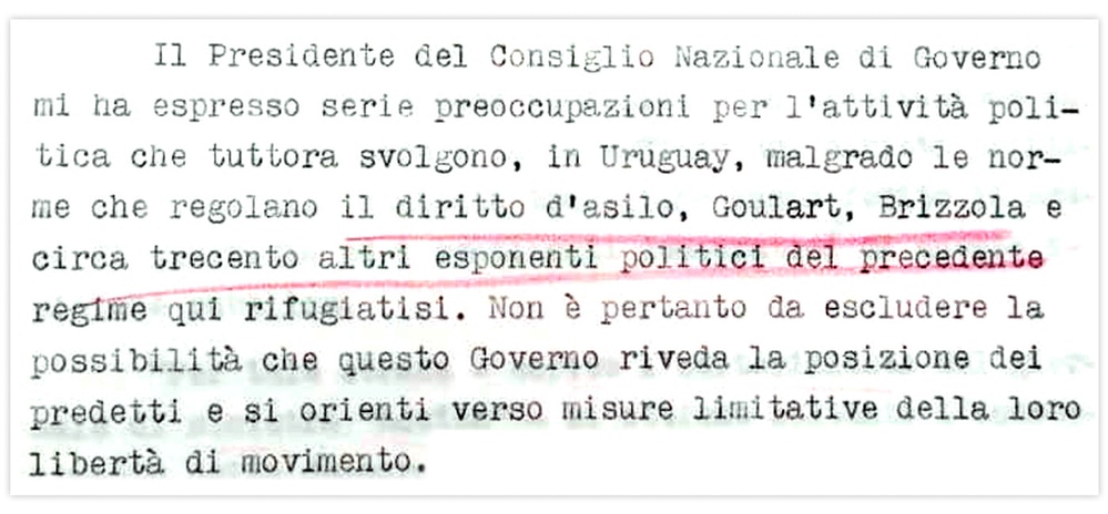 Ambos viviam no Uruguai. Cerca de 300 exilados políticos brasileiros viviam naquele país, segundo um dos informes da Farnesina, de 11 de junho de 1964, produzido pela embaixada italiana de Montevidéueo, intitulado “Política brasileira”. Ele foi enviado com cópia às embaixadas italianas do Rio de Janeiro e de Washington. O documento avisa que o “presidente do conselho nacional está preocupado com as atividades políticas dos refugiados brasileiros que vivem no país” – citando Jango e Brizola – e avisa que “o governo uruguaio poderá rever sua posição e adotar medidas restritivas de liberdade de movimento”.