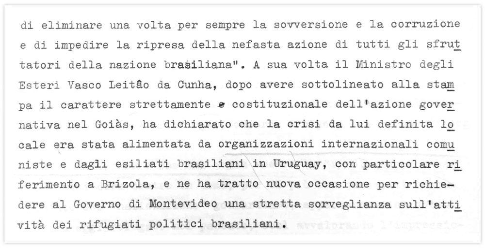 Um segundo documento enviado em 2 de dezembro pela embaixada do Rio ao governo italiano, e que traz no título “Desconforto nos círculos políticos parlamentares”, relata que o então ministro do exterior brasileiro Vasco Leitão da Cunha pediu ao governo do Uruguai uma estrita vigilância nas atividades dos exilados brasileiros – citando novamente Brizola.