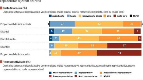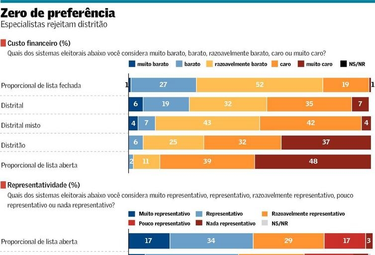 A enquete trouxe o sistema proporcional de lista fechada como o mais votado. Neste sistema, o eleitor escolhe a partir de uma lista preordenada pelo partido. Em segundo lugar veio o atual, de lista aberta, seguido de perto pelo distrital misto, em que uma parte da Câmara é preenchida pelo voto majoritário e outra, pelo proporcional. O distrital puro, que a enquete chamou de majoritário distrital, veio em quarto lugar.