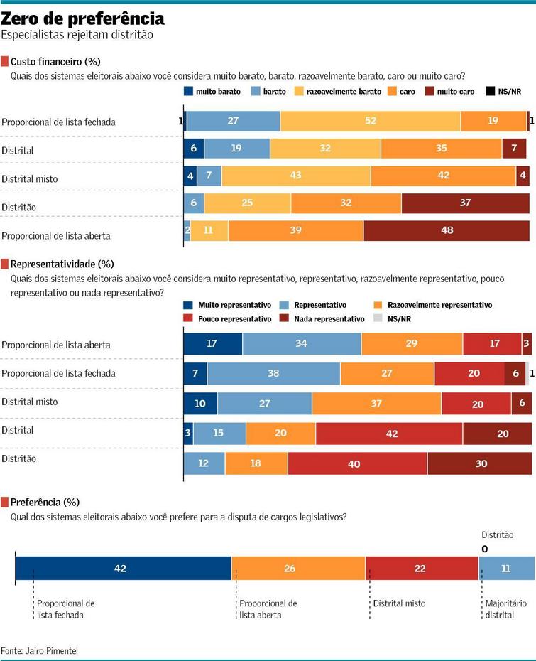 Aprovado na comissão especial na semana passada e prestes a ser votado no plenário da Câmara dos Deputados, o distritão não teria um único voto se o escrutínio tivesse como eleitores os cientistas políticos brasileiros. Noventa e quatro deles foram consultados, por rede social, em todo o Brasil, pelo professor da Fundação Escola de Sociologia e Política de São Paulo, Jairo Pimentel. O distritão, sistema que considera todo o Estado com circunscrição e elege os mais votados, independentemente de sua filiação partidária, não recebeu um único voto.