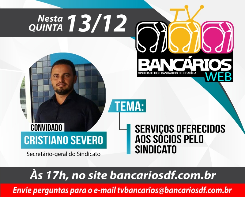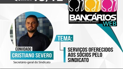 Na edição desta quinta-feira (13), o bancário do BRB e secretário-Geral do Sindicato, Cristiano Severo, apresenta todos os serviços oferecidos pela entidade aos associados. O programa será transmitido ao vivo pelas redes sociais do Sindicato a partir das 17h.