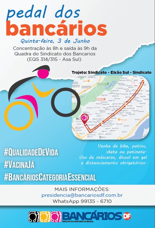 Bancários e bancárias, participem! Venham de bike, patins, skate ou patinete. Não se esqueçam do uso de máscaras e do álcool em geral, além de manter o distanciamento social obrigatório, bem como dos equipamentos de segurança.
