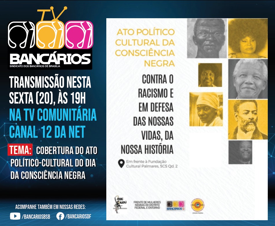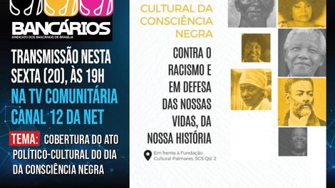 No Dia da Consciência Negra, o Sindicato realiza, em ação conjunta com outras entidades, organizações e parlamentares, um ato político-cultural contra o racismo e em defesa da vida e da história de pessoas negras. A partir das 19h desta sexta (20), o TV Bancários apresenta a cobertura do ato, que será realizado em frente a Fundação Cultural Palmares. O programa é transmitido pela TV Comunitária de Brasília (canal 12 da Net) e pela página do Sindicato no Facebook.