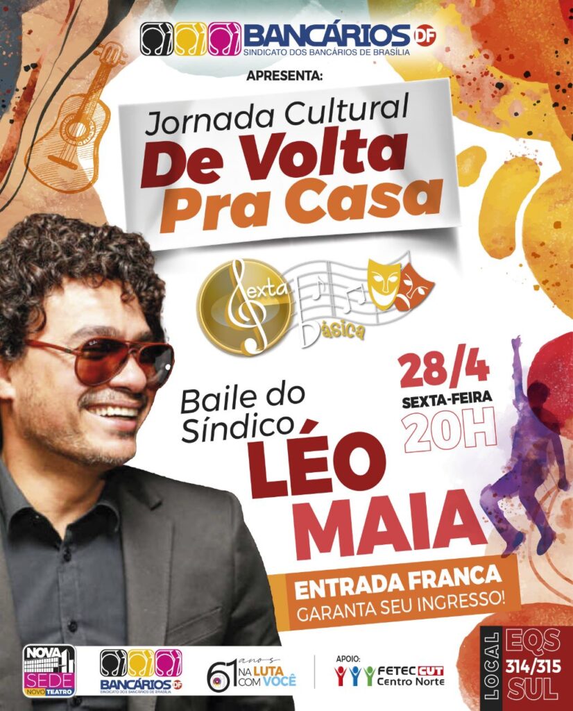 Este é o sétimo dia da Jornada Cultural, que tem programação até 1º de Maio, Dia do Trabalhador, com apresentação de artistas do DF e de outras regiões do país. Para participar dessa grande celebração à sede reformada, basta procurar a bilheteria do Teatro dos Bancários entre 11h e 19h30 para retirar seus ingressos. Para bancários sindicalizados, as entradas serão disponibilizadas até 24h antes do dia do evento. A comunidade acessa os ingressos no dia do evento.