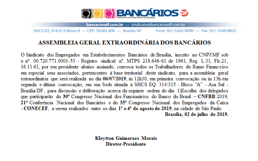 13h – Assembleia para eleger os delegados do DF aos congressos nacionais dos bancários do Banco do Brasil e da Caixa e à 21ª Conferência Nacional dos Bancários
