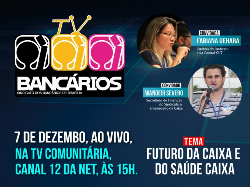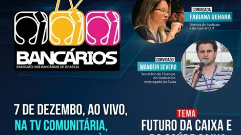 A edição do TV Bancários na TV Comunitária desta sexta-feira (7) recebe Wandeir Severo, diretor do Sindicato e representante dos empregados da Caixa, para falar sobre as ameaças de privatização que rondam o banco público. O programa será transmitido ao vivo, a partir das 15h, pela página do Sindicato no Facebook e pelo canal 12 da Net.